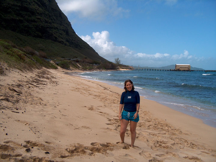 Yesterday, we tried to replay last weekend’s fun by driving around the southeastern part of the Island, past Hanauma Bay, Sandies, and Makapuu to Baby Maks. I love it there—it’s so haunting and majestic and captivating with the bright aqua water and 2000 foot Koolaus looming right over the beach. We snorkeled there again but the water was murky and rough so didn’t see a lot of fish. Did follow a turtle around for a while, though. That was really cool. Ate at the inimitable Sweet Home Waimanalo, which has the best plate lunches (get the lemon chicken and corn bread—actually get anything there—it’s all good)!