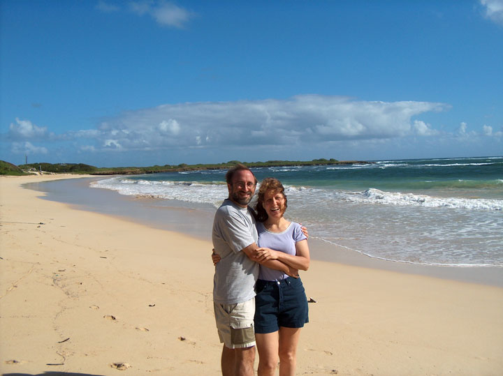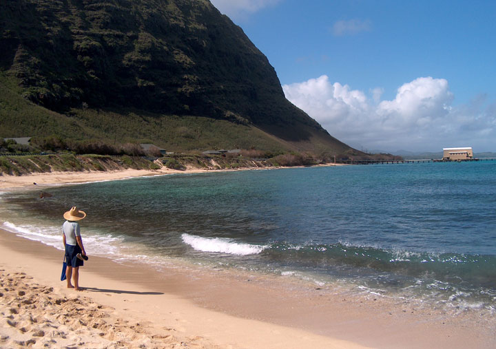 My old friend Mary Woollen picked us up and we drove over the Pali and northwest from Kaneohe to Malaekahana. The Koolaus were glowing in the morning sunlight and we could see way up the coast. I hate waking up that early on a weekend, but the view was worth it. The water was murky but the waves were fun and we body surfed for about two hours up there.