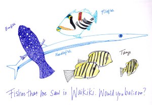 Mitch has been talking about this potato head fish. [Holding up a papaya he points to the top] “It’s got eyes right here on top and this big body and it’s got little excuses for fins on the side that looks like they’re good for nothing. Maybe the big head is its defense.” I didn’t draw this fish but here are some of the ones I did see.