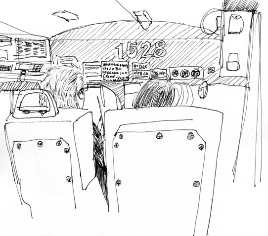 Marin Headlands and the GG Bridge which looks different every day. It takes me 45 minutes to get to my stop in SF so I have plenty of time to read or email or listen to music. Sketching is challenging, due to the very bumpy ride but I don’t mind. It’s a quiet ride as, amazingly, most people don’t use their phones on the commute.