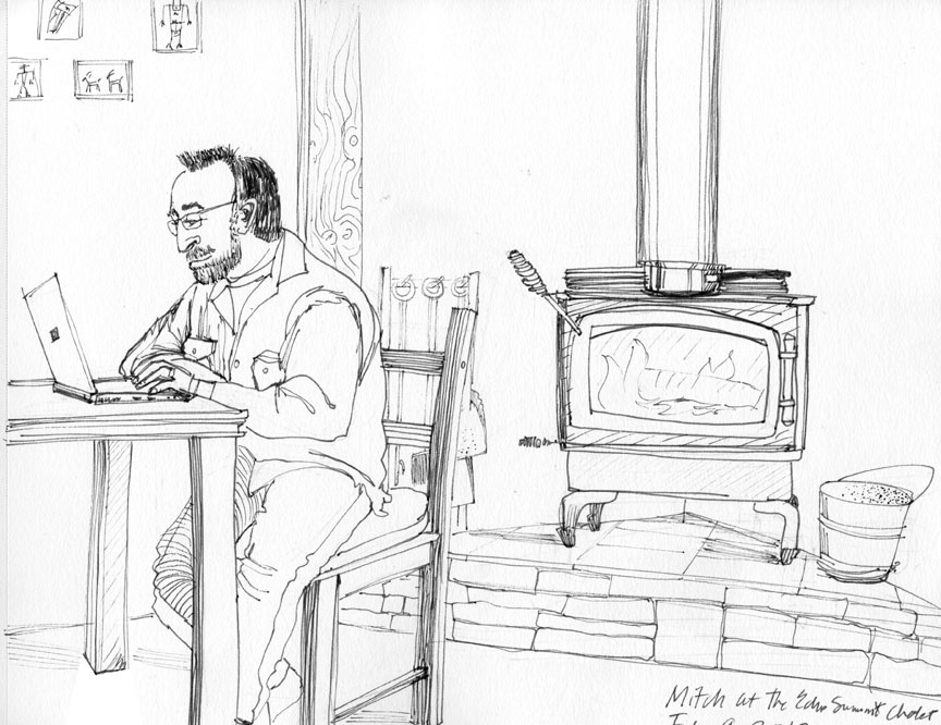 The drawing is from our wonderful vacation in Tahoe. The snow situation was sad but we still had a fantastic, fun time with our friends Leila and Ron and Ron’s sister, Rhea.