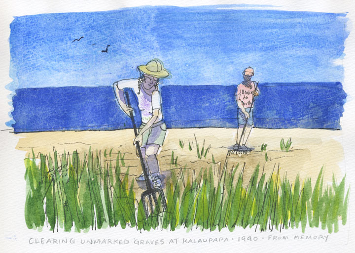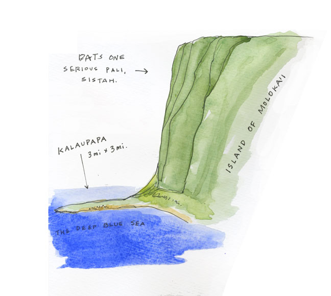 But I digress. Listening to the book brought back flashes of my own visit in 1990. I had joined a weekend Sierra Club service trip to help clear some of the many unmarked graves. We flew from Honolulu to Kaunakakai and then in a puddle jumper to that apron of land bordered by dramatic, vertical pali (ridges) and the Pacific ocean itself. Were it not for its terrible past, the place might be considered a remote paradise. Kalaupapa is now a national historical site.