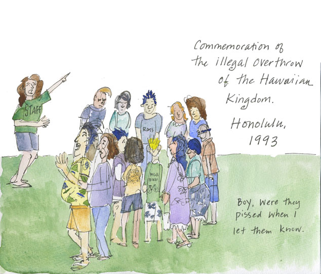 in 1993, there was a major commemoration for the 100th anniversary of the overthrow, including a reenactment using the exact words of the conspirators. The director of that performance was concerned that people would become angry and violent with the actors, so she engaged peacekeepers to help calm the crowd and I was one of these. We had to move the play from one part of the grounds to another but forgot to leave a sign regarding that fact. About 15 minutes before it started, I had the dubious honor of redirecting the crowd, which had gathered in the wrong location.