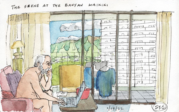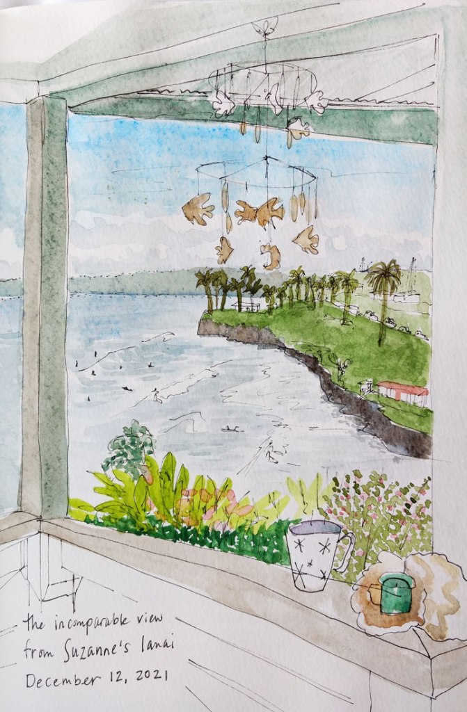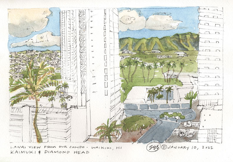 What to do after a day at the beach? sketch the scene from our condo. I loved our (obstructed) view of Diamond Head and Kaimuki, especially in the late afternoon sunlight.