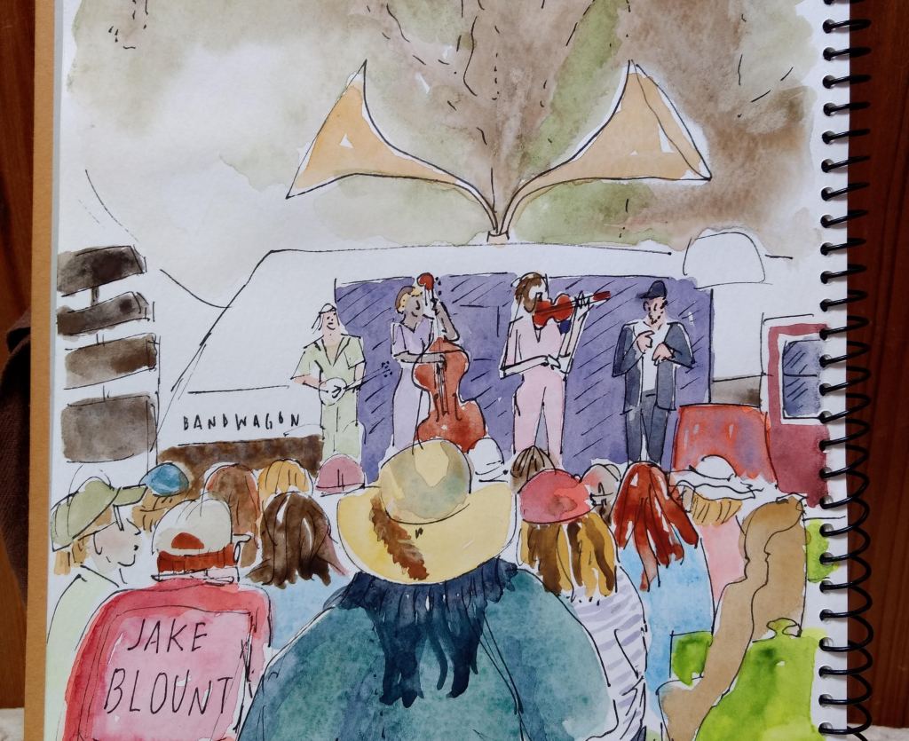 Jake Blount’s band at the Bandwagon Stage. He’s from Providence, Rhode Island. Yes, those are matching pastel jumpsuits.