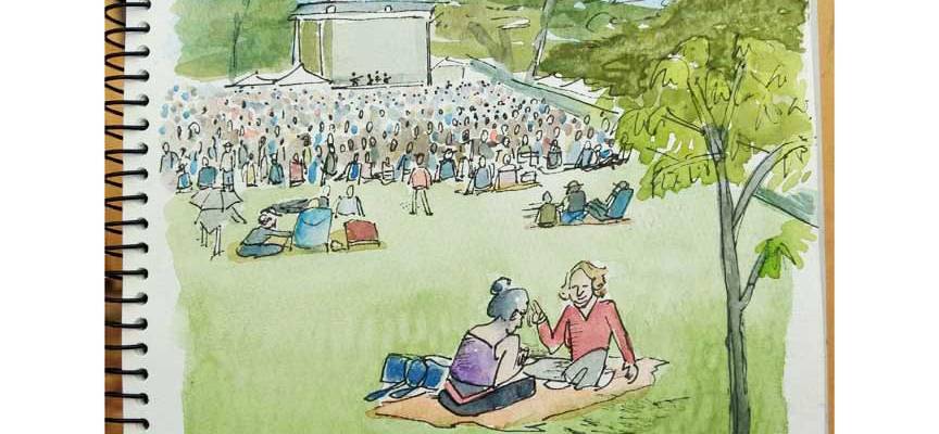 Louise said that her halau’s weekly get-togethers kept her sane over the last two years of Covid. We were honored to join them for some songs. Mitch played along with his guitar. I sketched.