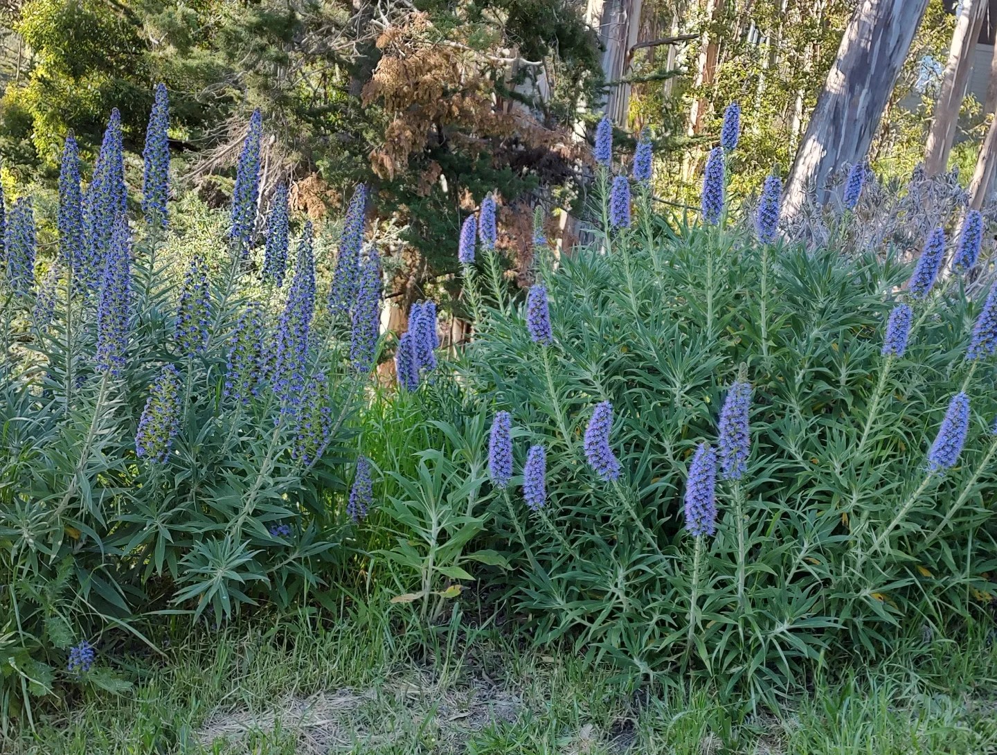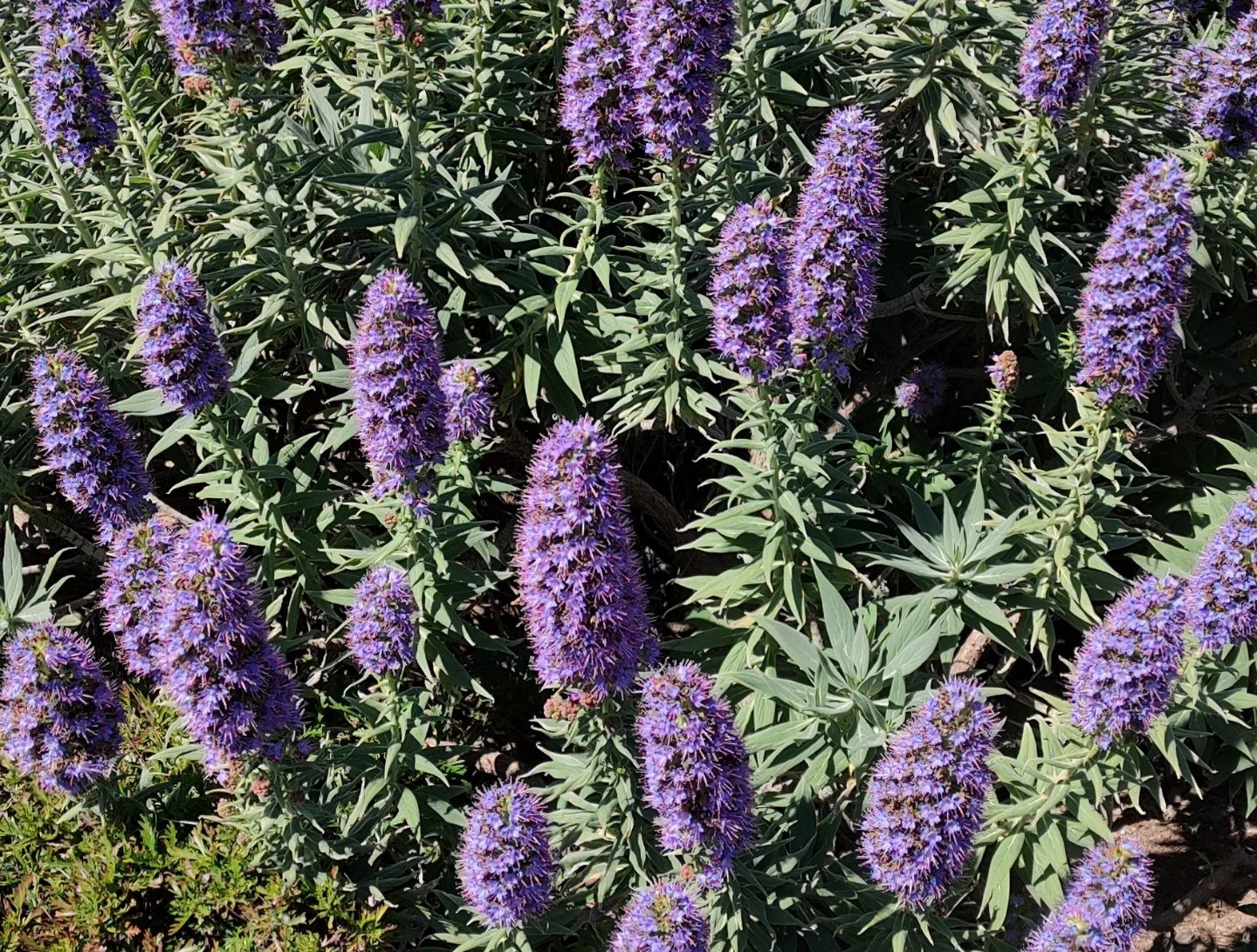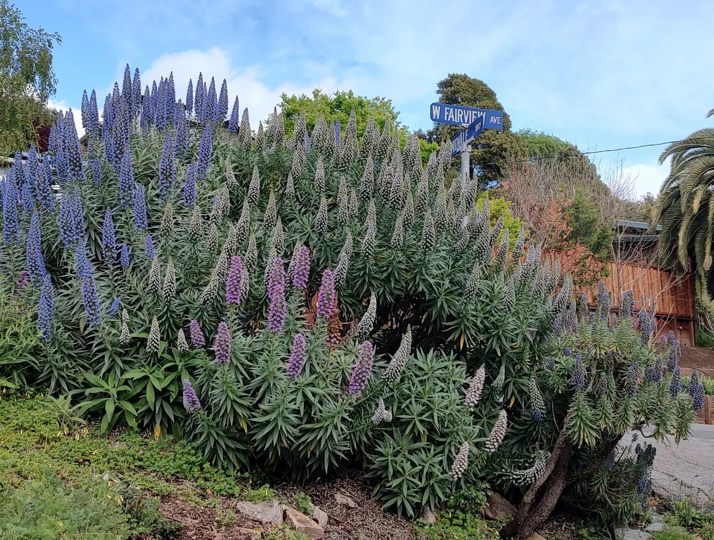 Pride of Madiera is an invasive species that thrives in NorCal coastal areas. The blossoms on this bush start as cone-headed shoots, which grow into a plethora of tiny purplish blue flowers, some with fuchsia hairs . The bushes can grow to be 20 feet tall.